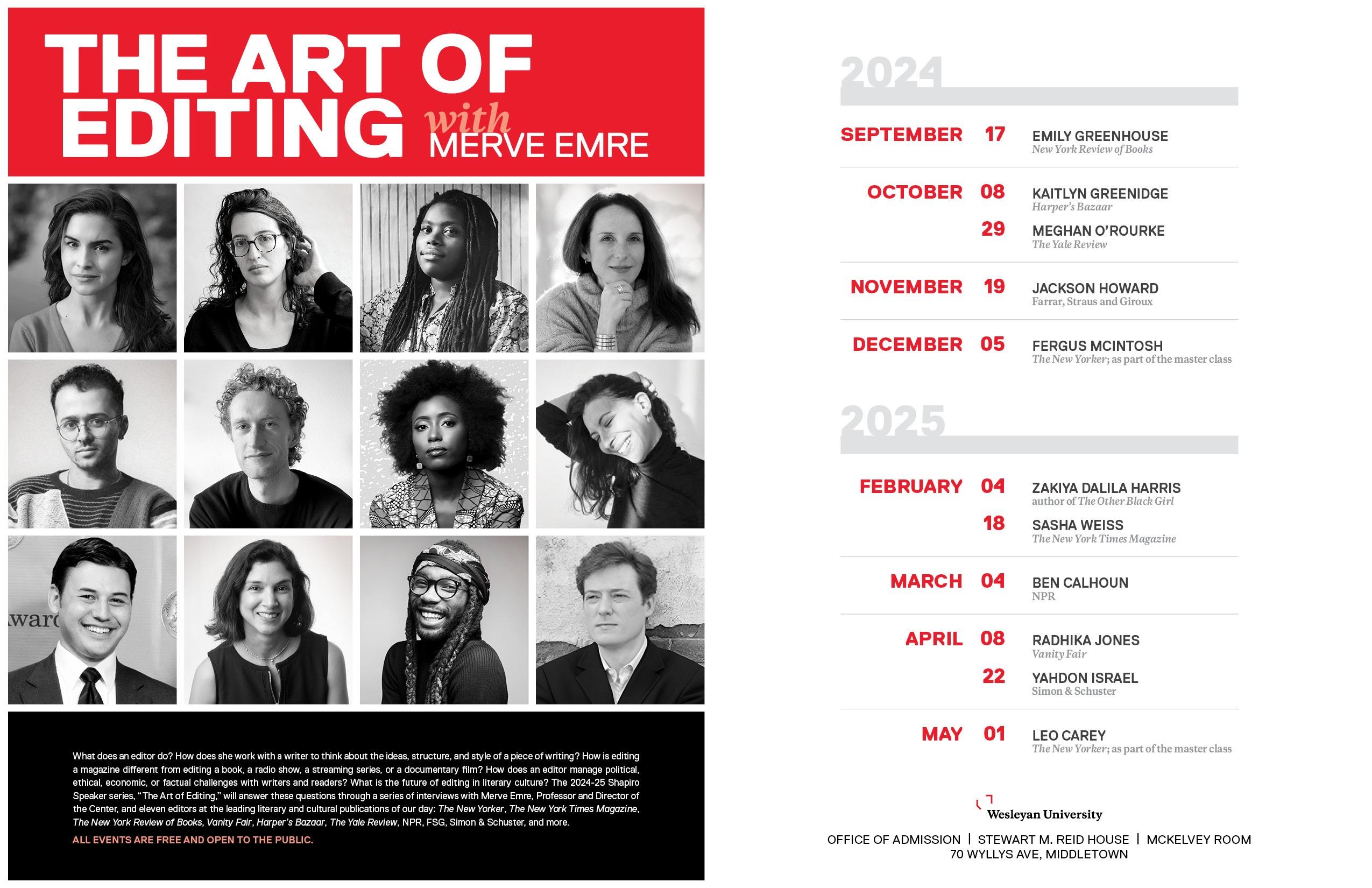 What does an editor do? How does she work with a writer to think about the ideas, structure, and style of a piece of writing? How is editing a magazine different from editing a book, a radio show, a streaming series, or a documentary film? How does an editor manage political, ethical, economic, or factual challenges with writers and readers? What is the future of editing in literary culture? The 2024-25 Shapiro Speaker series, "The Art of Editing," will answer these questions through a series of interviews with Merve Emre, Professor and Director of the Center, and ten of the visionary editors at the leading literary and cultural publications of our day: The New Yorker, The New York Times Magazine, The New York Review of Books, Vanity Fair, Harper's Bazaar, The Yale Review, NPR, FSG, Simon & Schuster, and more.
